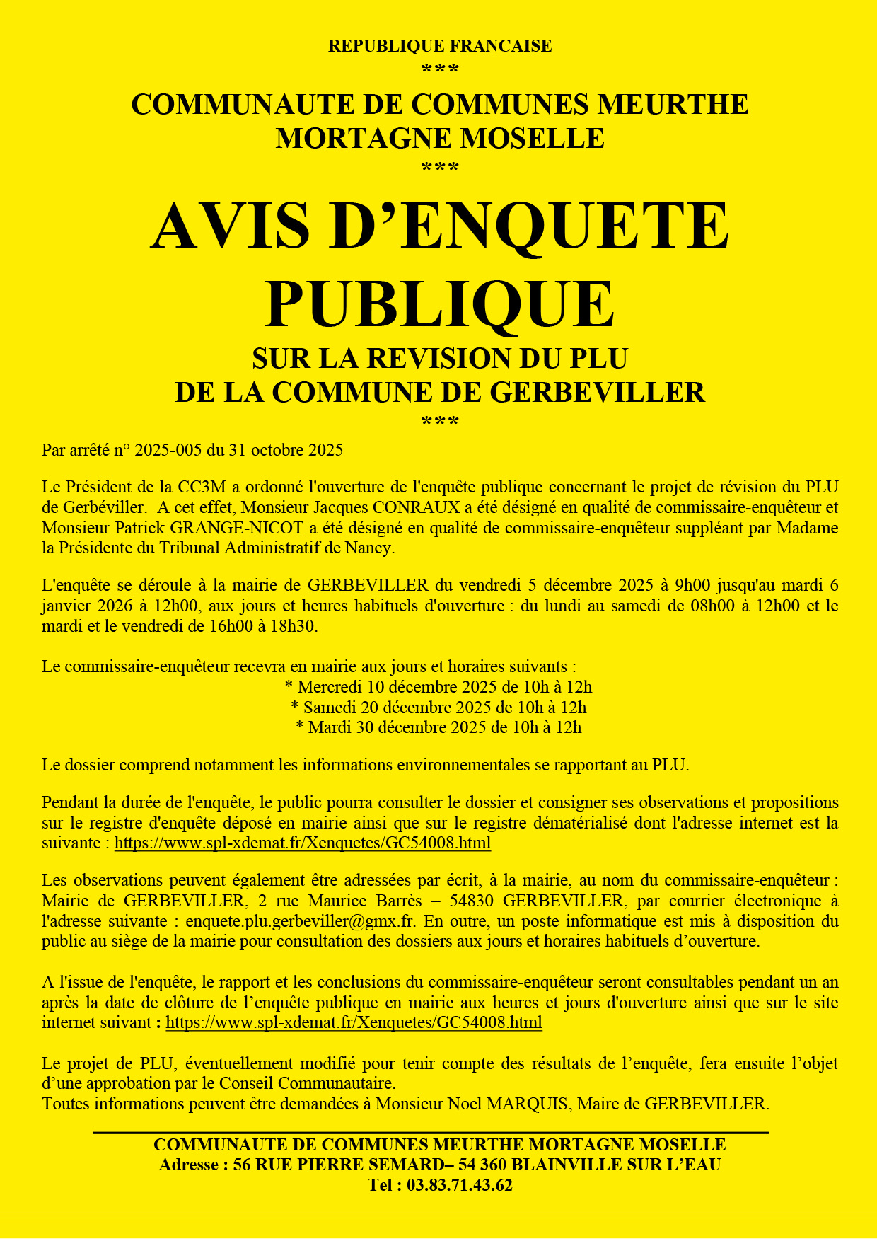 Par arrêté en date du 31 octobre 2025, le Président de la CC3M a ordonné l’ouverture de l’enquête publique portant sur le projet de révision du PLU de Gerbéviller.