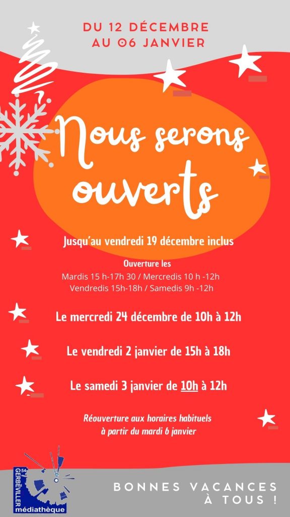 La médiathèque municipale sera ouverte aux horaires habituels jusqu’au 19 décembre inclus… Vous trouverez sur le visuel les horaires d’ouverture jusqu’au 6 janvier.